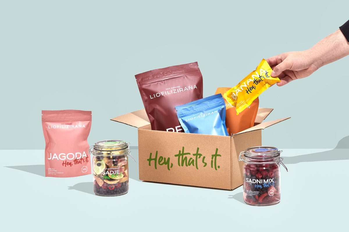 To je to, samo sadje in nič drugega. Voda mora ven! Mi, liofilizatorji sadja in zelenjave, se zelo zavedamo, da je voda vir življenja, a smo jo kljub temu nagnali ven! Odstranili smo jo iz prebranih zdravih plodov, zato vam je v rokah ostal le sadež, poln arom, beljakovin, mineralov, vitaminov in antioksidantov. Liofilizacija je proces konzerviranja, med katerim se zamrznjena voda (v sadežu) neposredno spremeni v paro in trdno agregatno stanje zamenja za plinasto, ob čemer se poleg hranljivih snovi ohranijo intenziven okus, barva in oblika. Ključne faze zeeelo počasnega procesa so izbira plodov, povišan pritisk v komorah in spreminjanje temperature. Odstranjena voda pogosto dosega 99,9% čistosti, kar pomeni, da imate v rokah skorajda enako sadje, kot bi ga pravkar odtrgali, le trajno konzervirano in vedno pripravljeno za uporabo. Uporaba: Hrustljavo liofilizirano sadje si privoščite vsakič, ko bi sicer segli po sadni malici ali obroku, a svežega sadja ni pri roki. Lahko ga jeste neobdelanega, če ga boste zmešali z vodo, limono, sladkorjem ali različnimi začimbami, pa lahko z njim pripravite osvežilne in polnovredne sokove. Liofilizirano sadje je odlična obogatitev jogurtov, kefirjev, muslijev in smutijev, prav tako pa boste svoji kreativnosti pri pripravi peciva, sladoleda in drugih sladic dodali povsem nov zagon. Tako sadje je športnikom vedno pri roki in je na voljo za uporabo pred, med in po športu. Da vam energijo, ko jo najbolj potrebujete.